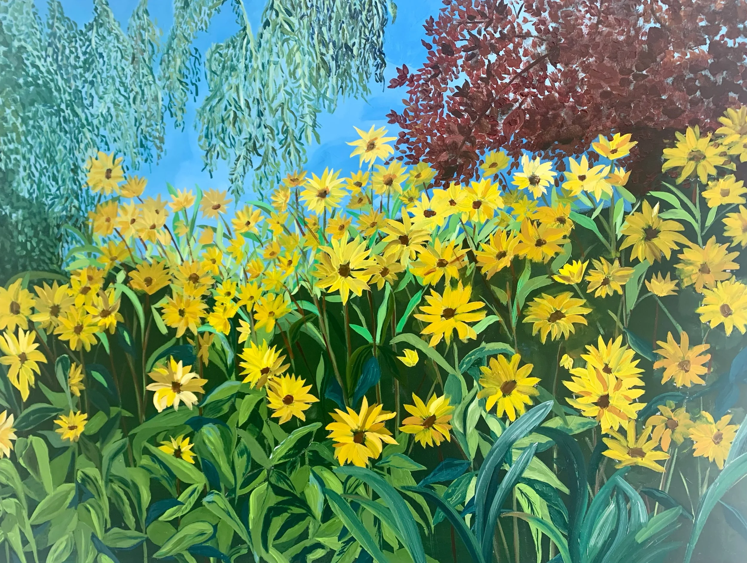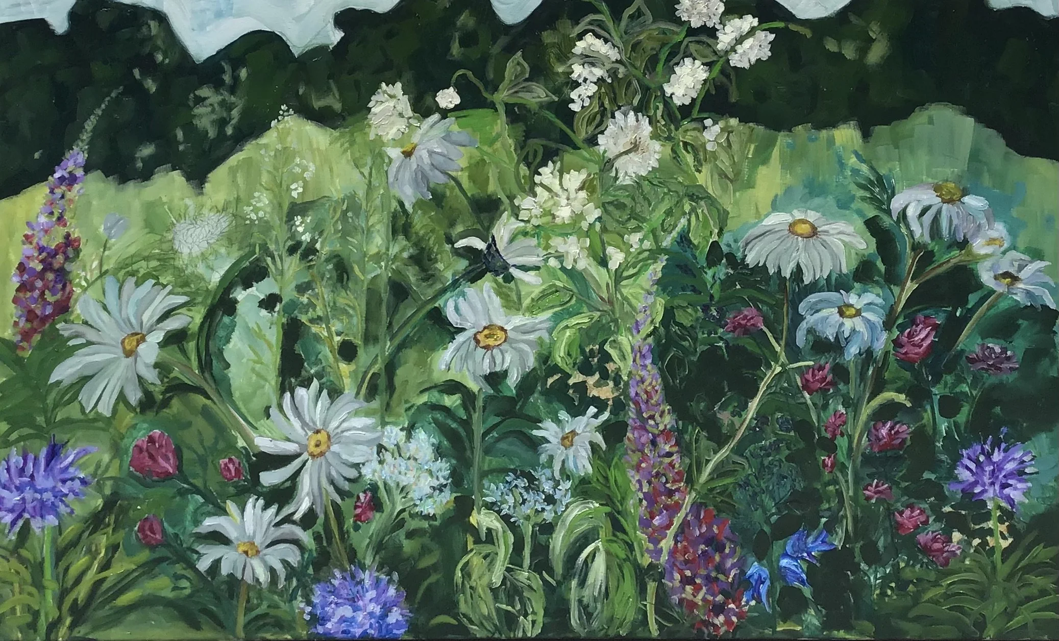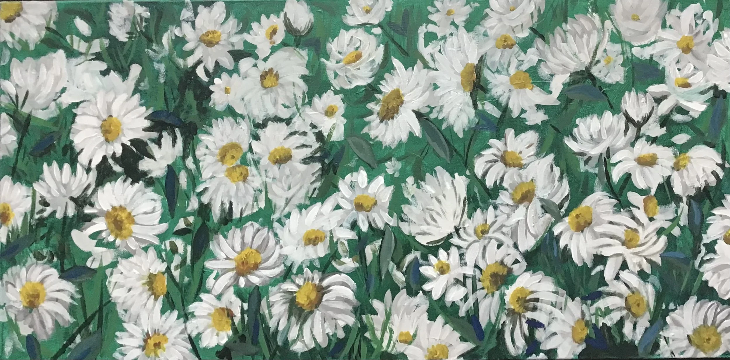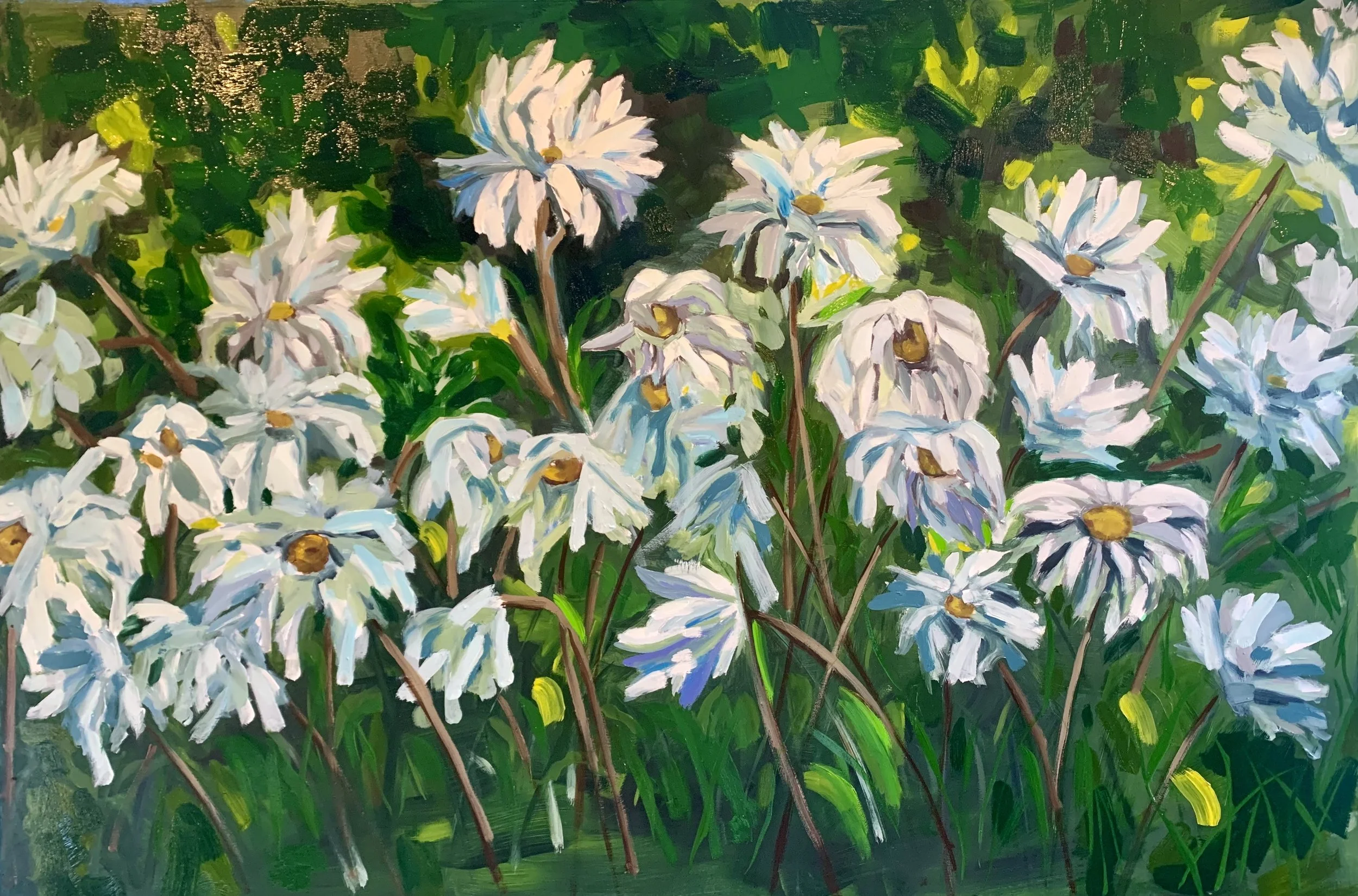 Sunday’s Daisy. Whimsically minded Oil on cotton rag, 100 x 70cm, 350gsm Available at The Captains Quarter Gallery, Akaroa Troubadours le Jardin Flowing in the wind Oil on Canvas 150 x 100cm x 4cm Available at The Captains Quarter , Akaroa Oil on Canvas 120 x 100cm Available at S.O. at Home in the country Sunday Daisies Oil on canvas, 150 x 100cm SOLD